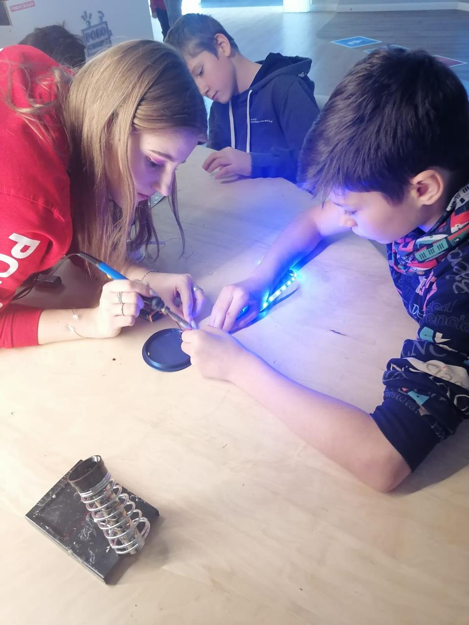 В завершении экскурсии, все дети приняли участие в мастер-классах: кто-то мастерил ночник «Спутник», кто-то паял щетку-вездеход, а кто-то собирал робота.