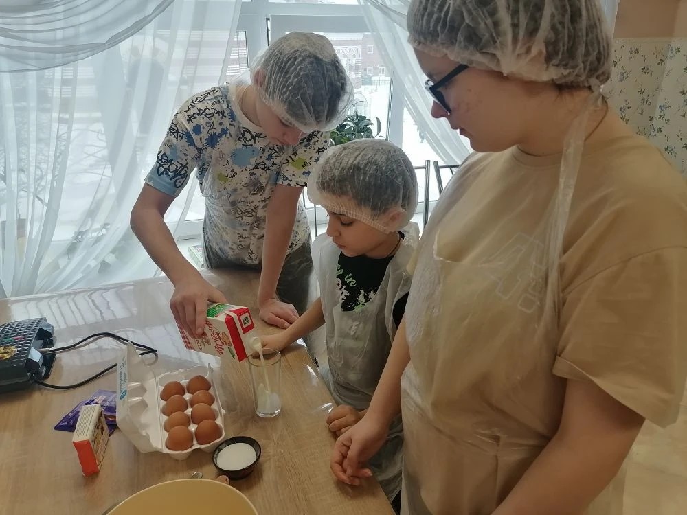 Первая группа ребят с энтузиазмом взялась за самое ответственное – замешивание теста. Отмеряя ингредиенты, смешивая их с ловкостью настоящих кондитеров, они с нетерпением ждали, когда их творение превратится в нечто волшебное. Воздух наполнился предвкушением, а в воздухе витал сладкий аромат ванили.