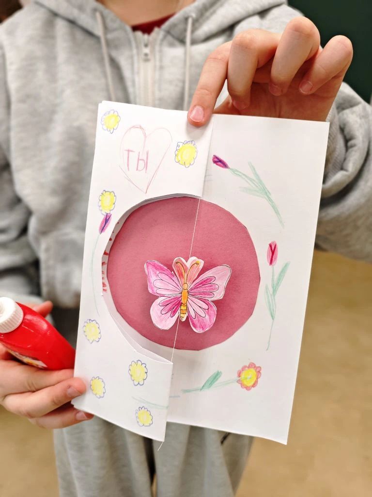 Младшие ребята создали необычные открытки для любимых мам — с яркими бабочками, которые «оживают» и кружатся, стоит только открыть подарок. Мамины помощники, не иначе!