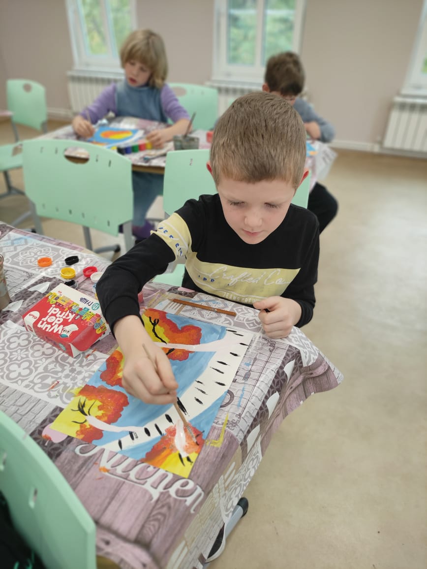 А в творческой мастерской царила осенняя, но совсем не унылая атмосфера! Наши художники создали замечательные работы: грузовичок, везущий щедрый урожай, и яркую берёзку с листвой, которая словно светится осенним солнцем!