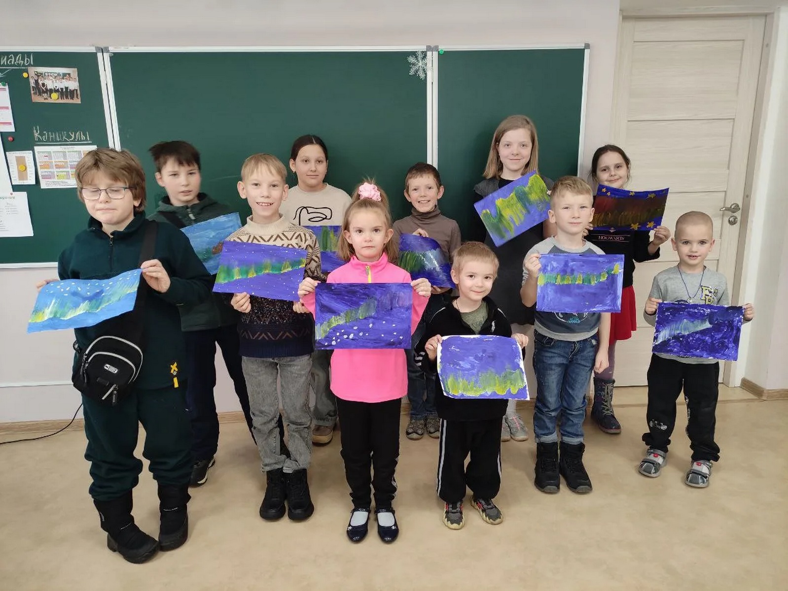 Младшие воспитанники переносили на бумагу магию зимней ночи, рисуя яркое северное сияние.