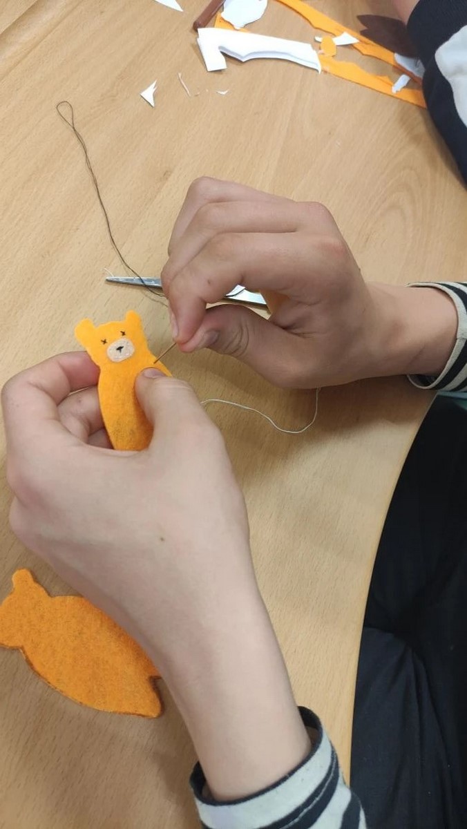 Старшая группа осваивает новый материал: учащиеся приступили к изготовлению игрушек из фетра. Первым проектом стали медвежата. Ребята учатся работать с тканью, делать аккуратные швы и набивать игрушки. Работа кропотливая, но первые результаты уже радуют.